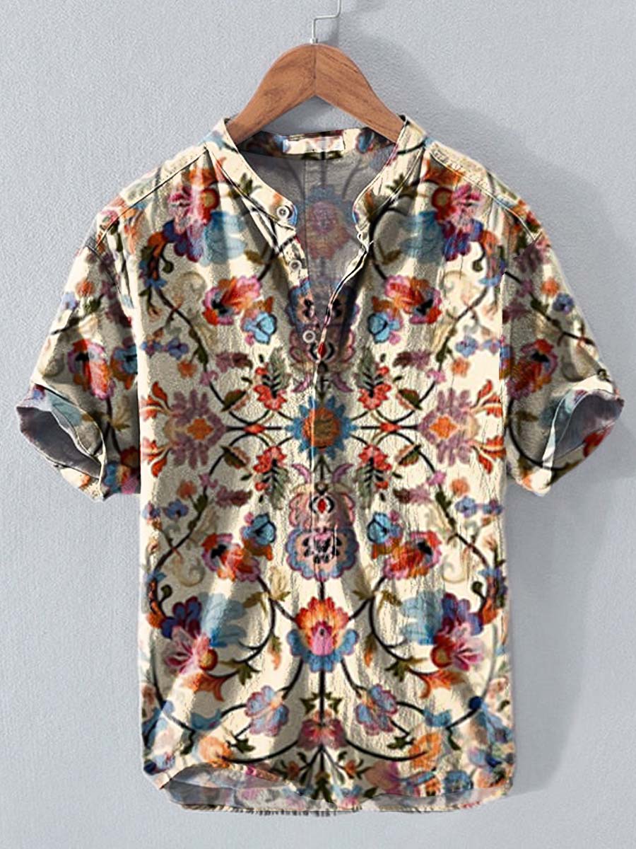 Vintage Flower Symmetry Pattern Art Print Casual Cotton And Linen Polo