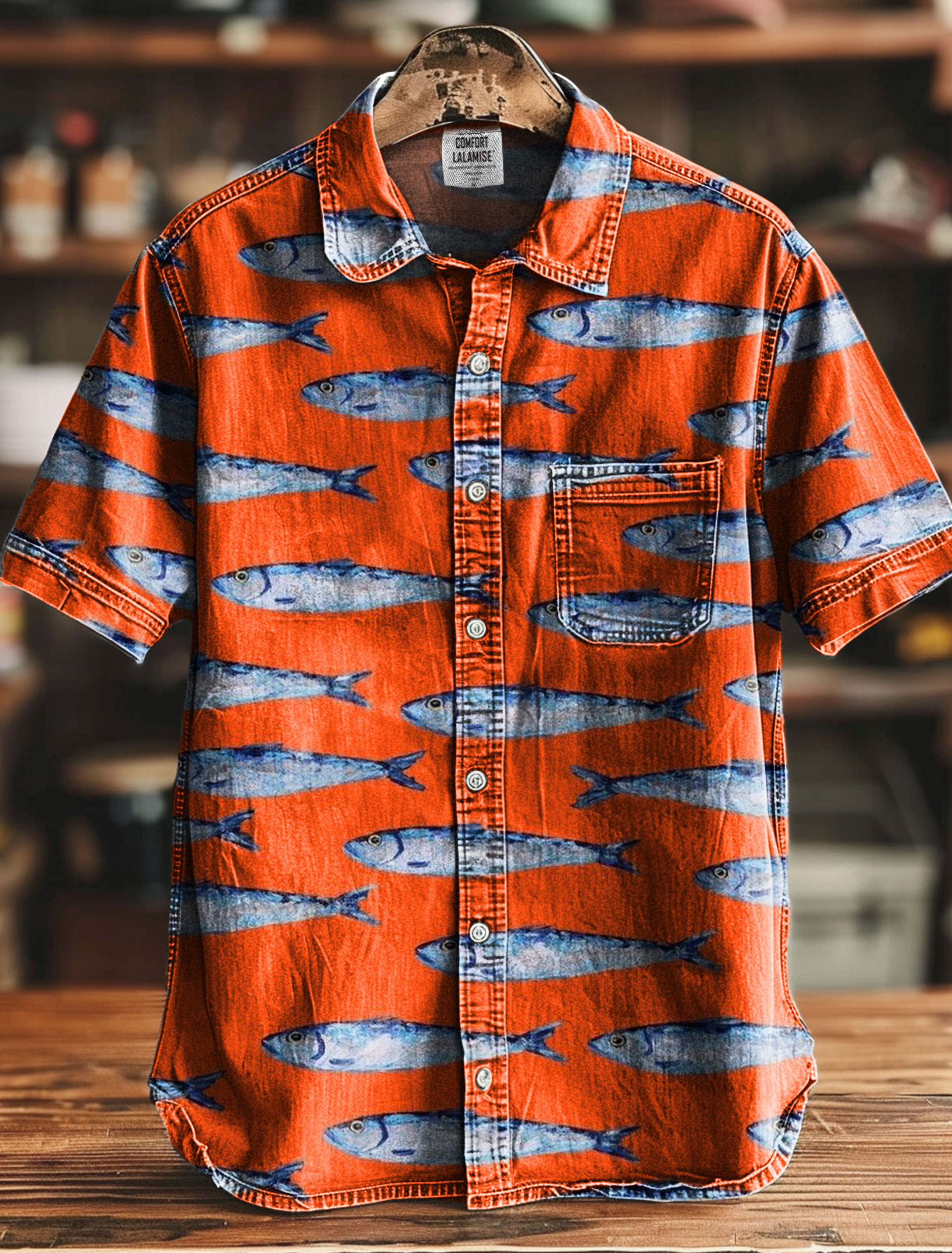 Orange Sardines Vintage Print 100% Cotton Denim Shirt