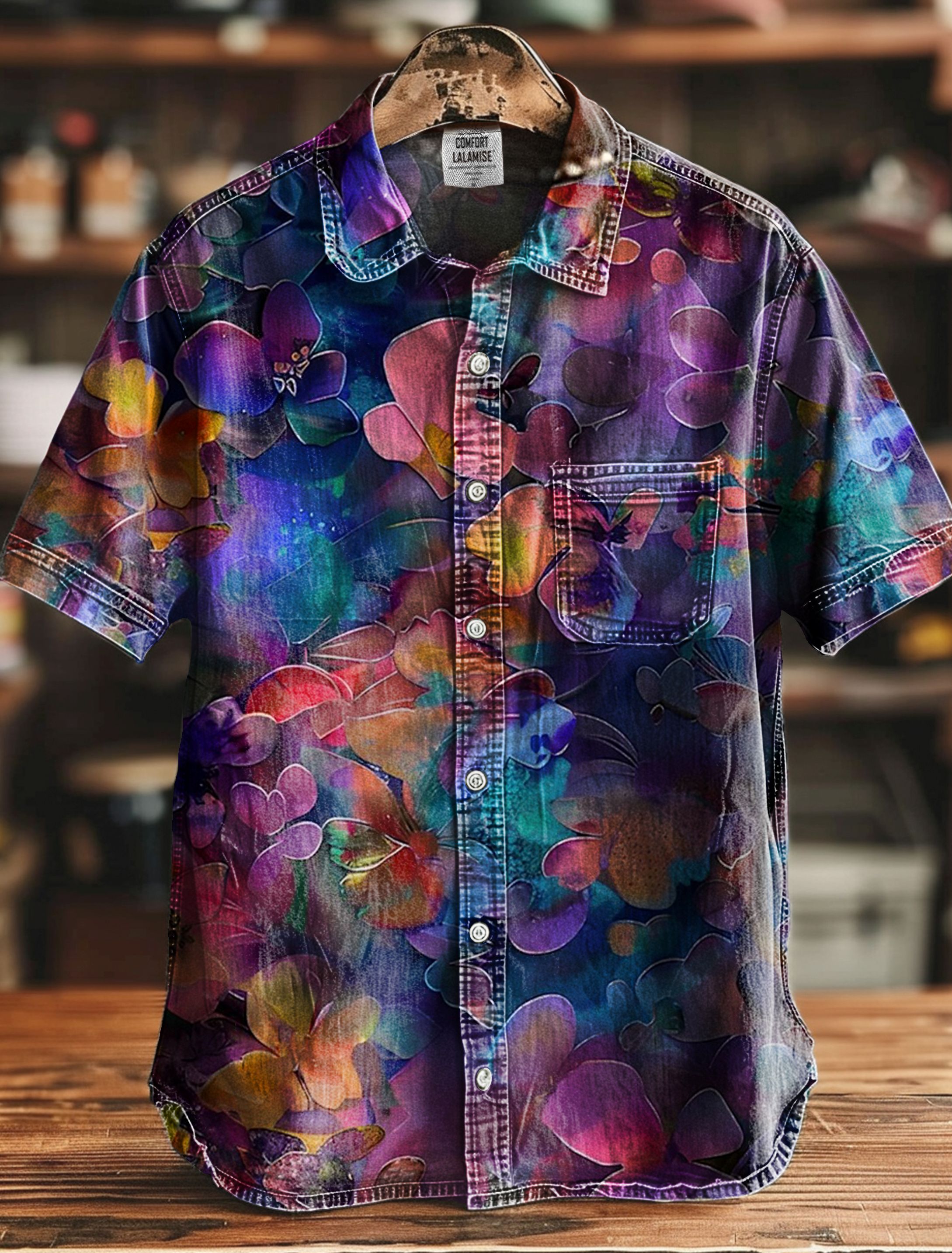Vintage Colorful Gradient Floral Print 100% Cotton Denim Shirt