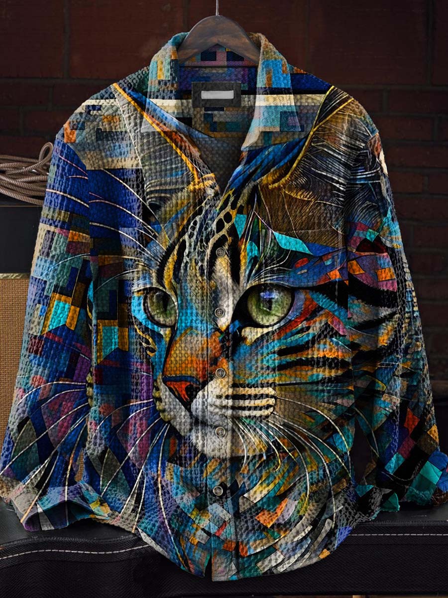 Geometry Abstract Cat Art Print Casual Waffle Long Sleeved Lapel Shirt