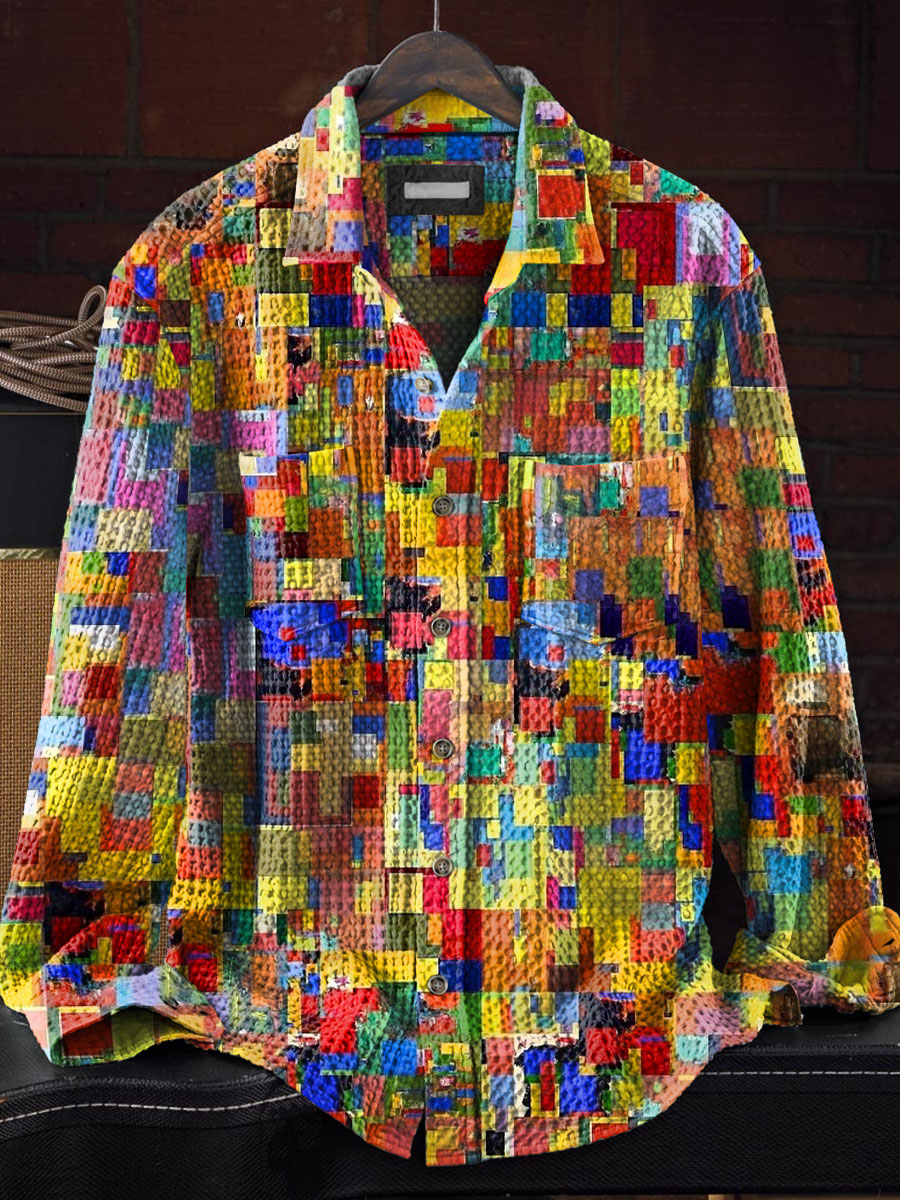 Spotted Colorful Art Print Casual Waffle Long Sleeved Lapel Shirt