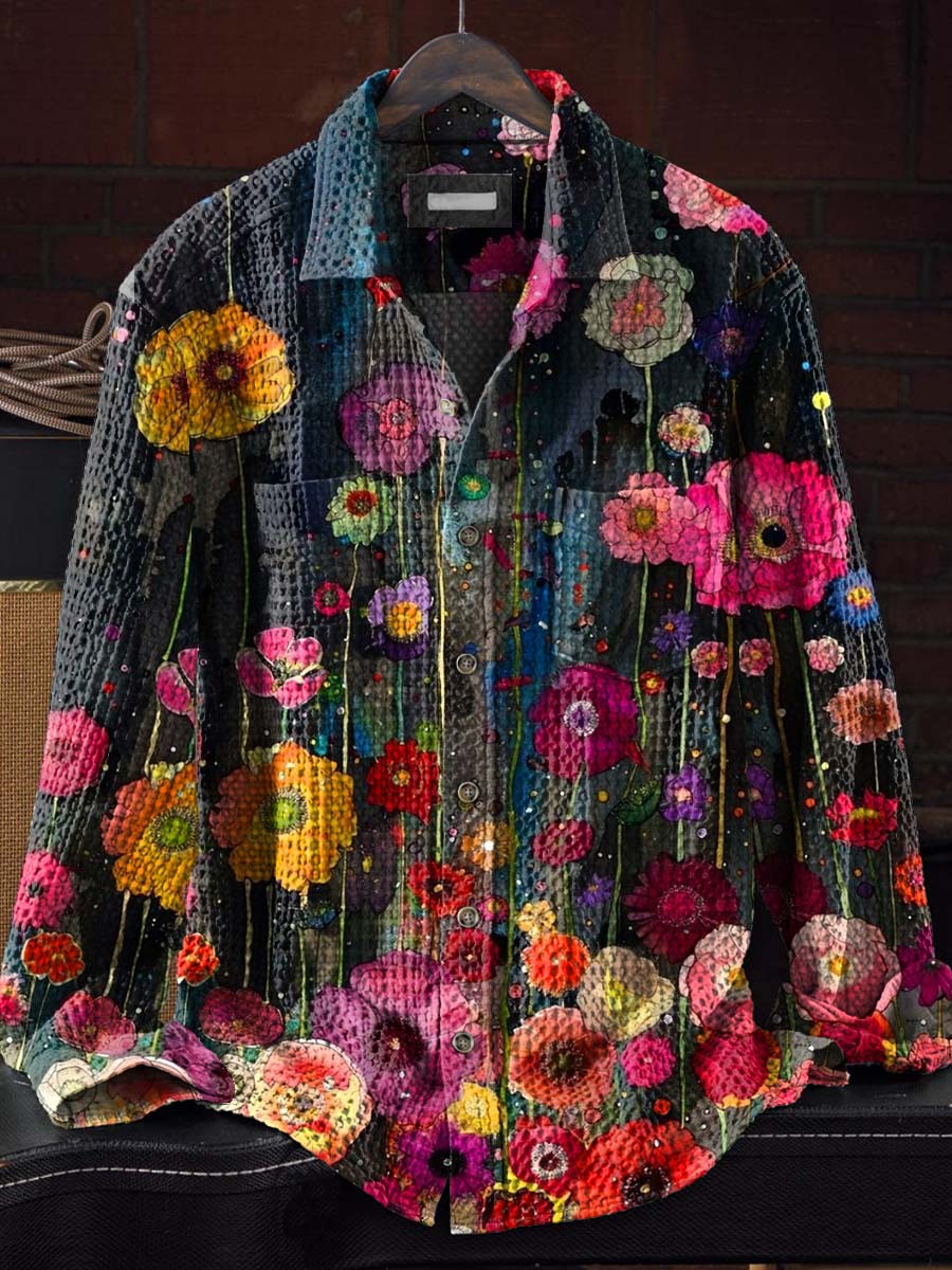 Watercolor Flowers Art Print Casual Waffle Long Sleeved Lapel Shirt