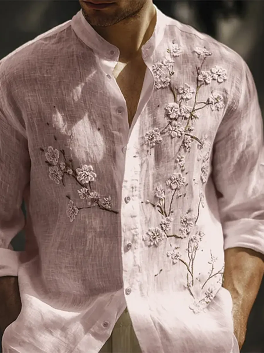 Men's Casual Print Cotton Long-sleeved Stand-up Collar Shirt