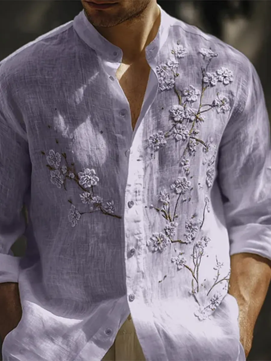 Men's Casual Print Cotton Long-sleeved Stand-up Collar Shirt