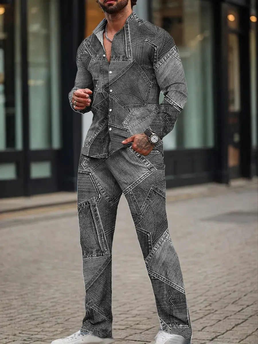Men's Denim Print Long-sleeved Trousers And Shirt Set