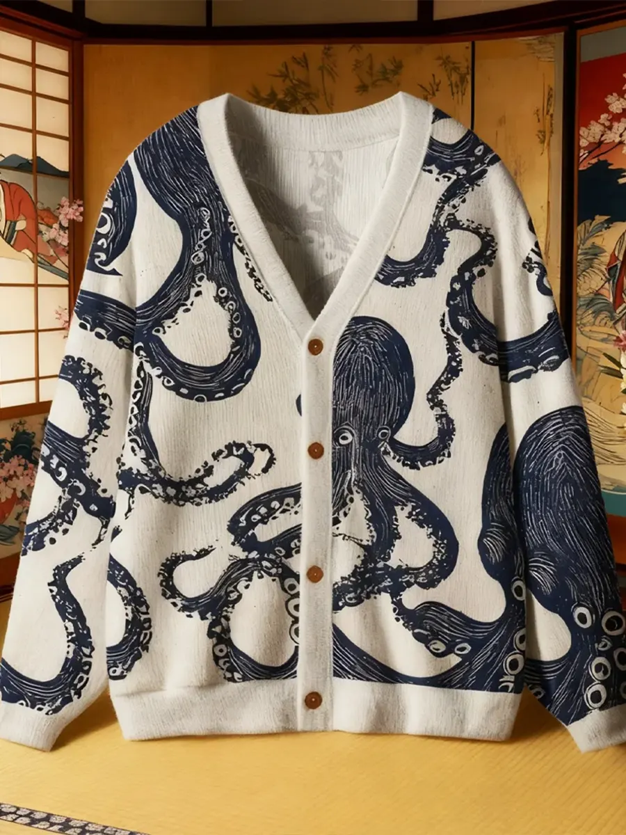 Retro Octopus Art Print Casual Knit Cardigan Jacket